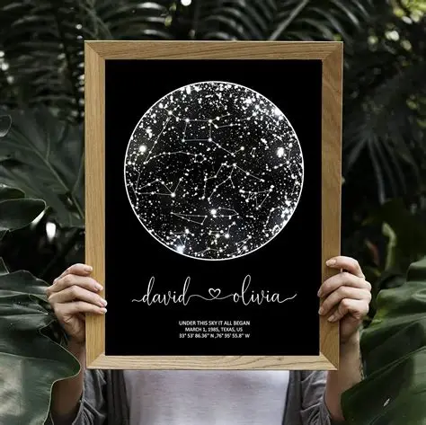 Capture a special moment in time with a custom star map poster. Simply provide the date and location, and we’ll create a stunning print of the night sky. A heartfelt gift for anniversaries, weddings, or new beginnings.